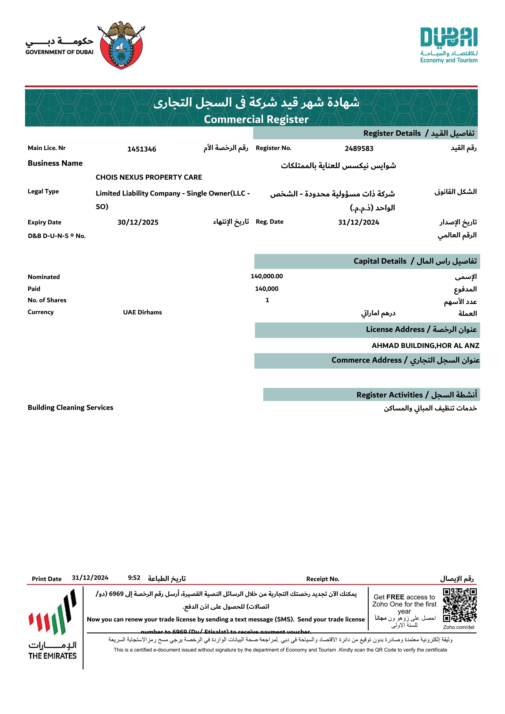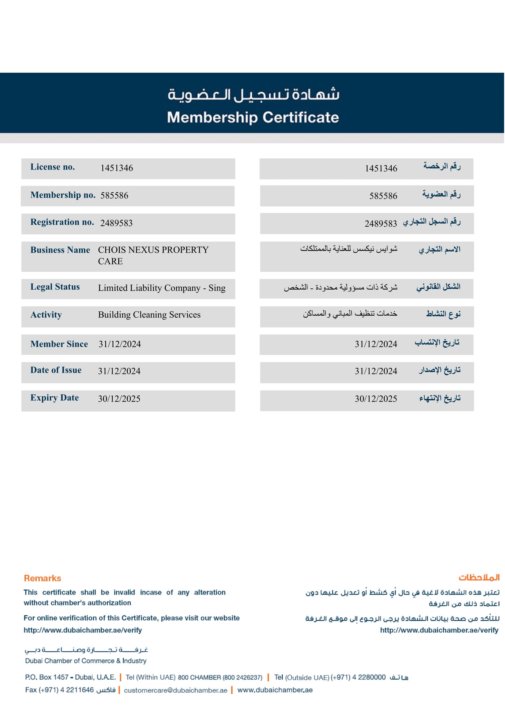 Chois Nexus Property Care LLC is a legally registered and licensed company under the United Arab Emirates (UAE) laws. We are fully compliant with all the federal and municipal laws that govern facility management and cleaning services in Dubai. Our company is registered with the Dubai Department of Economic Development (DED) and holds all the necessary trade licenses and certifications to operate in the cleaning and property care sector.